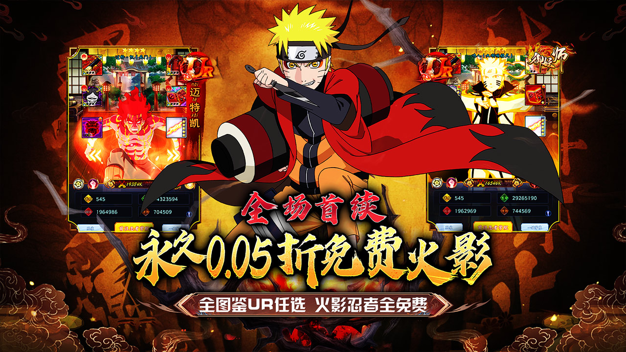 【游戏介绍】 鸣人、佐助,纲手,自来也,卡卡西,超多经典火影忍者欢迎你的到来,游戏内还原了火影忍者的经典剧情和场景,从木叶村到终极谷,与所有的忍者共同体验前所未有的激情热血的冒险旅程! 【游戏特色】 1、永久每日648元,免费代金券根本花不完! 2、永久充值0.05折,欢迎来到0.05折免费火影世界! 3、UR忍者全免费,登录送UR自选箱,免费集齐不是梦! 4、UR鸣人降临礼,在线就送七代目火影-终极UR鸣人!