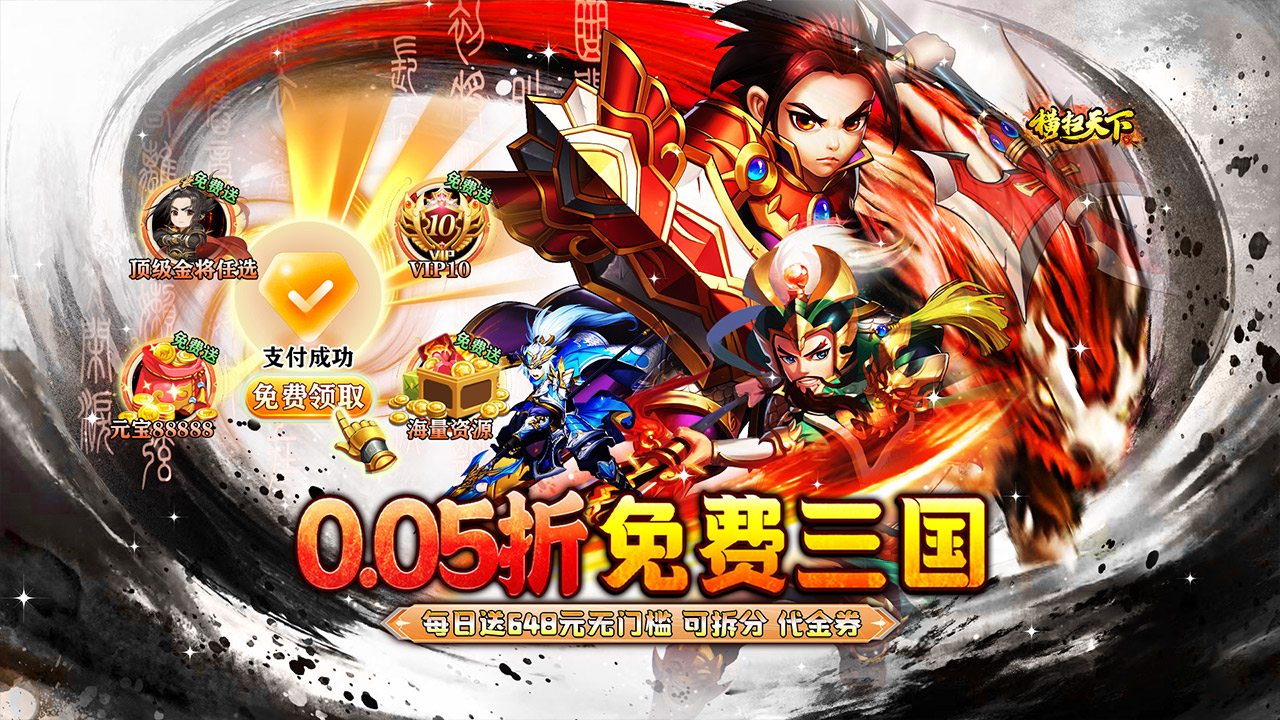 《横扫天下》是一款三国神话题材创新策略卡牌手游!0.05折免费三国来袭,每日免费送648元无门槛可拆分代金券!创角福利顶级金将/专属装备自选开局一统六国,还有超多历史名将等你来招募!经典战役元素,妙绝伦立绘,酷炫霸气技能,轻松享受萌版三国的乐趣。乱世出英雄,谱写新传奇!